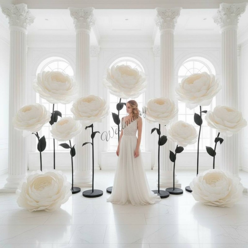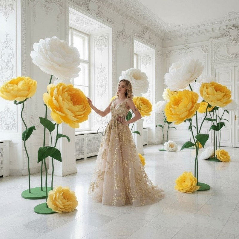 В наличии и на заказ ростовые бумажные пионы в аренду в различных цветовых гаммах. Подставки и стебли для больших цветов возможно индивидуально изготовить в любом цвете.