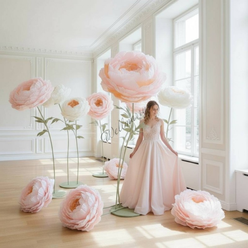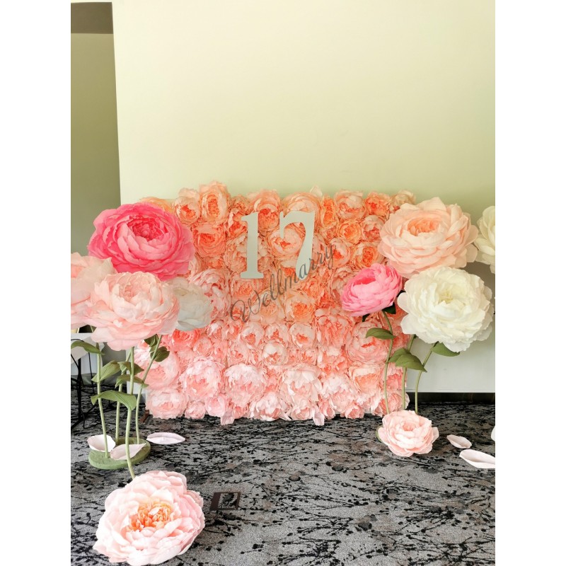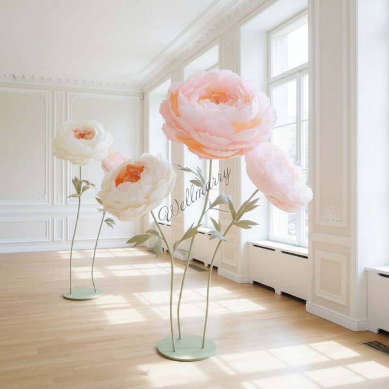 В наличии и на заказ ростовые бумажные пионы в аренду в различных цветовых гаммах. Цветы могут быть на одинарной, двойной, тройной подставке. Стоимость указана за один цветок.