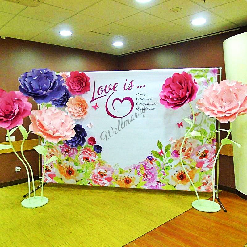По желанию можем украсить баннер объемными большими цветами, а также предоставить гигантские ростовые цветы. Цветы предоставляются в аренду!
