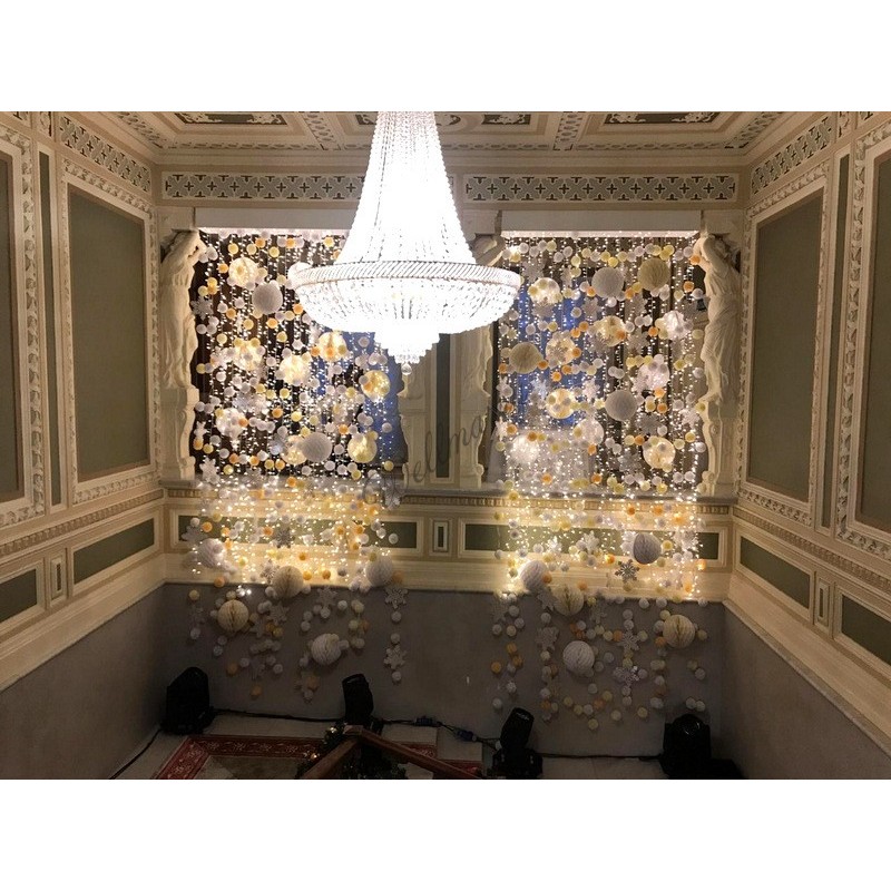 Гирлянда из бумажных шаров состоит из лески и шариков из бумаги тишью.