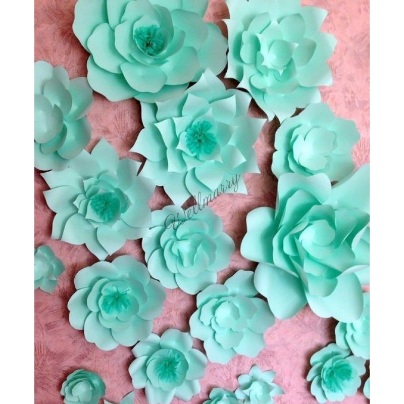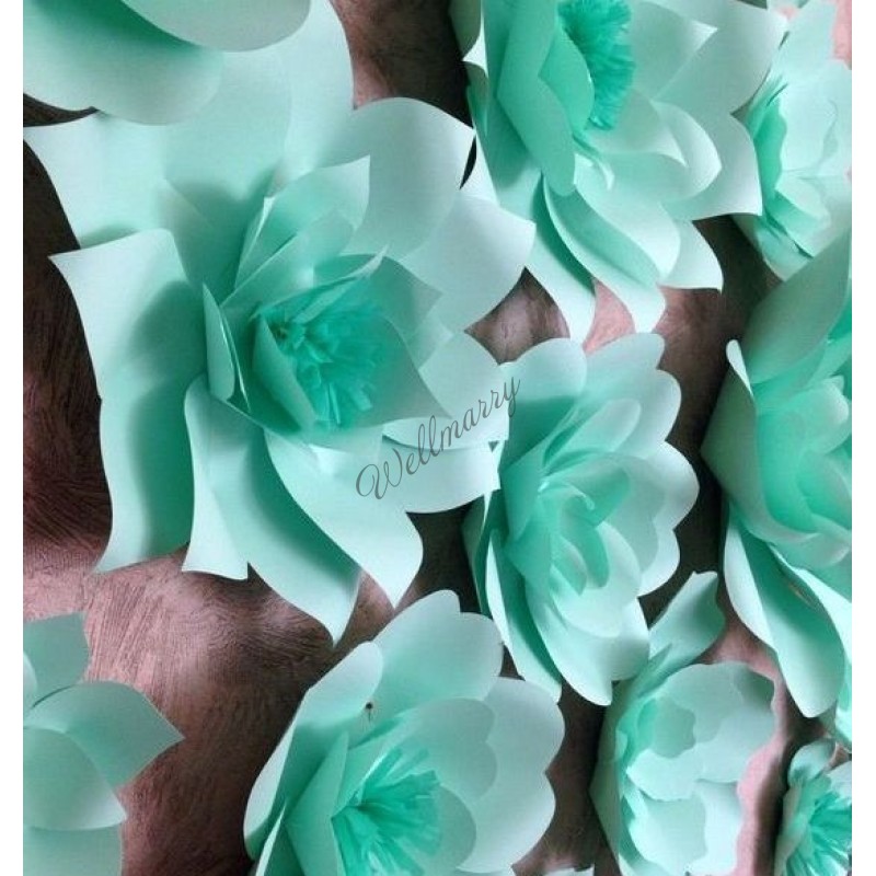 Бумажные цветы прекрасно подойдут для оформления свадьбы в стиле тиффани, ими можно украсить зал, зону для фотосессии (баннер/пресс вол), стол молодоженов, задник.
