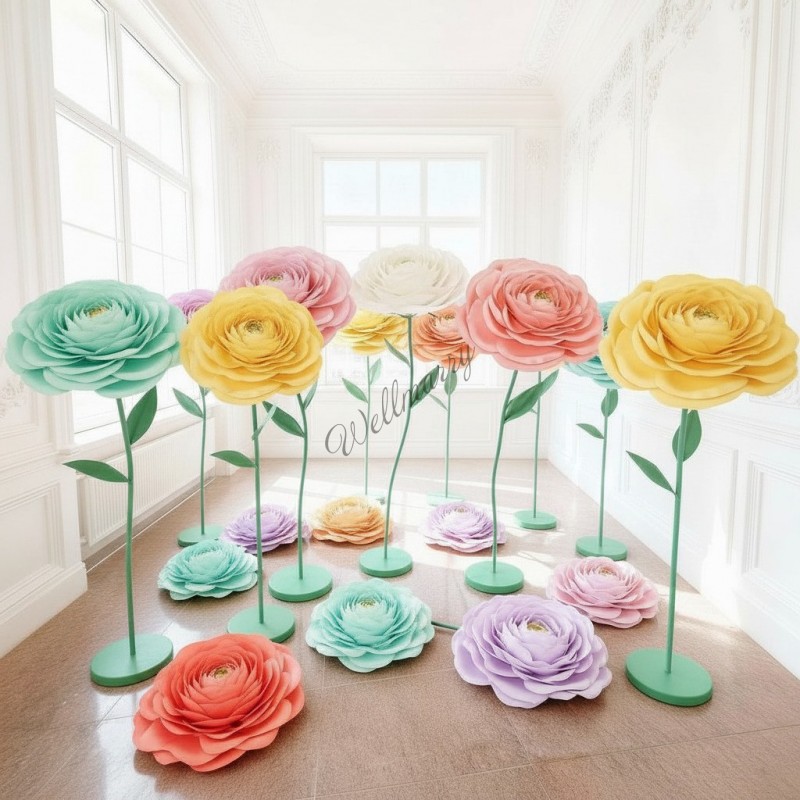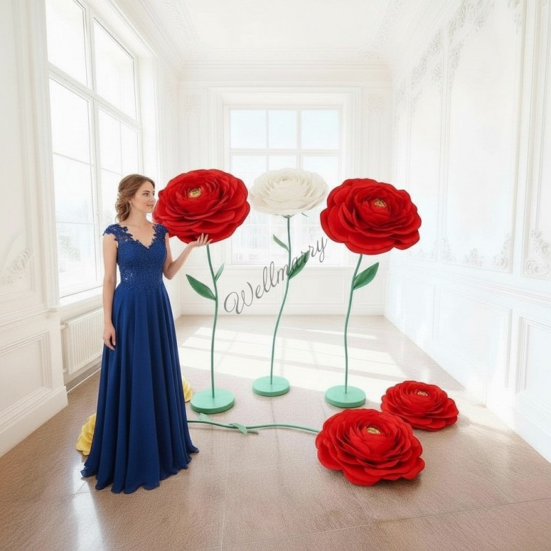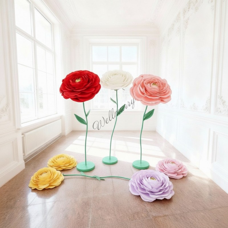 Ростовой цветок "Ранункулюс" (влагоустойчивый) может быть выполнен из изолона или фоамирана различных цветовых оттенков. Цветок можно мыть под прохладной водой, протирать влажной салфеткой, использовать для декора в дождливую погоду. Гигантские цветы на ножке прекрасно подойдут для оформления фотозоны, витрины, свадьбы, дня рождения или любого другого события.