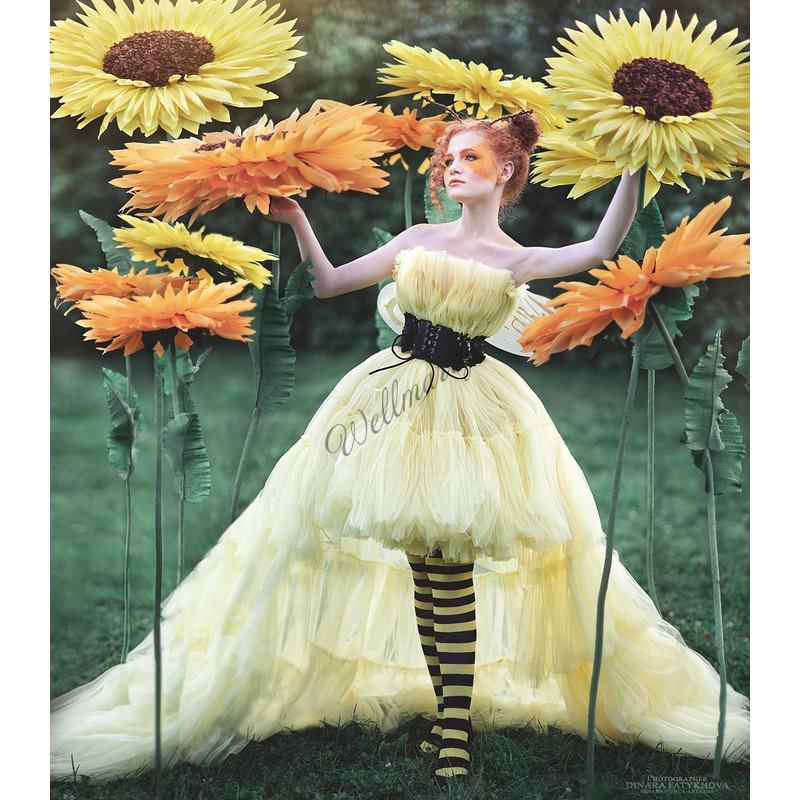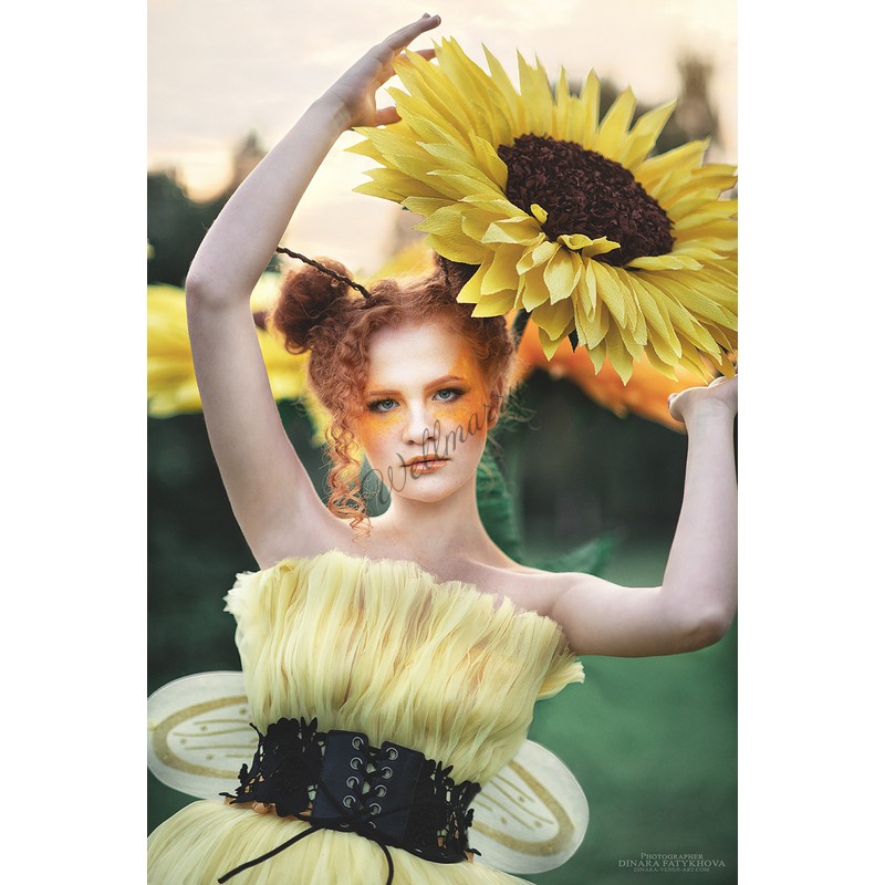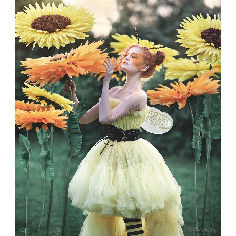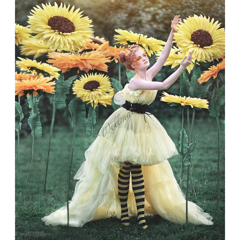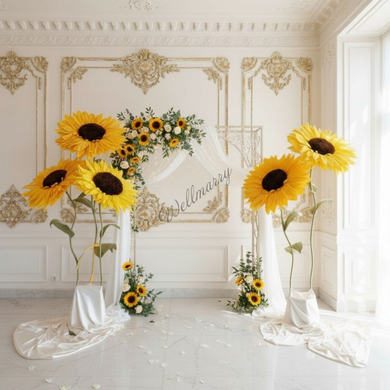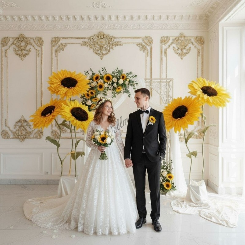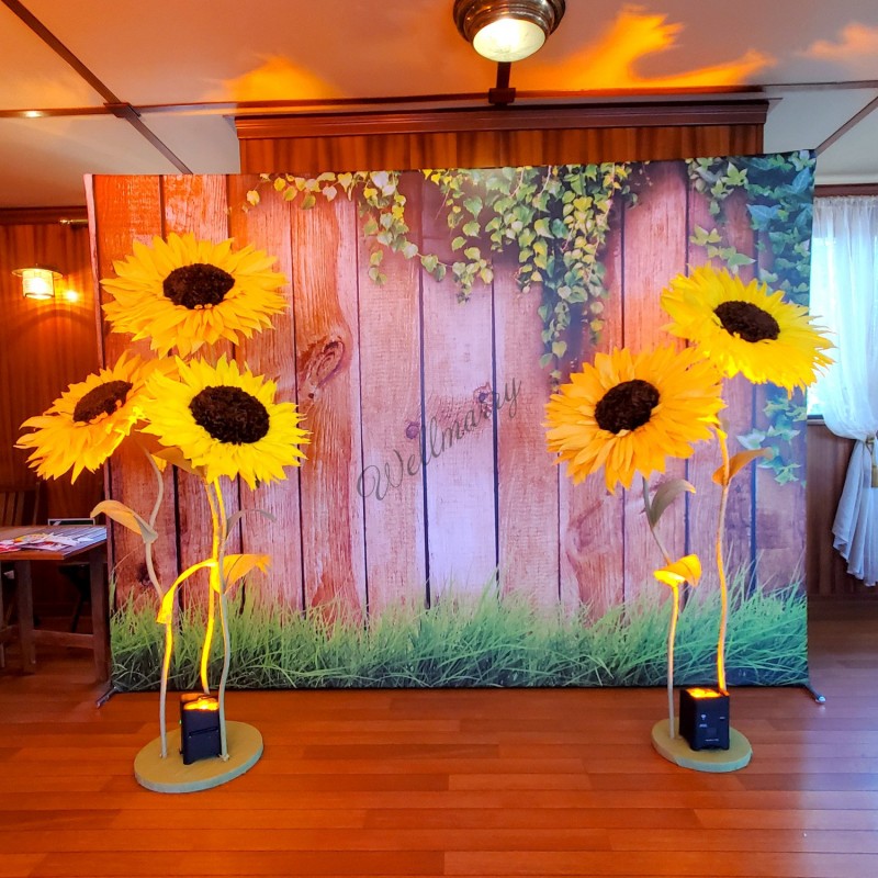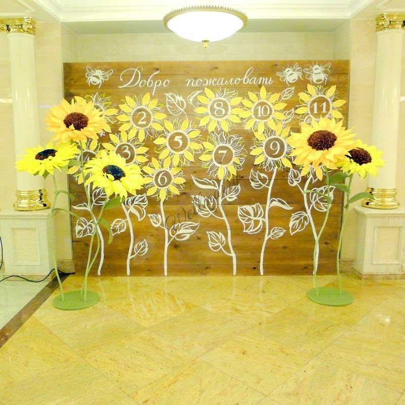 Ростовые цветы "Подсолнухи" выполнены из гофрированной бумаги естественных желтых оттенков. Гигантские цветы на ножке прекрасно подойдут для оформления фотозоны, витрины, свадьбы, дня рождения или любого другого события.